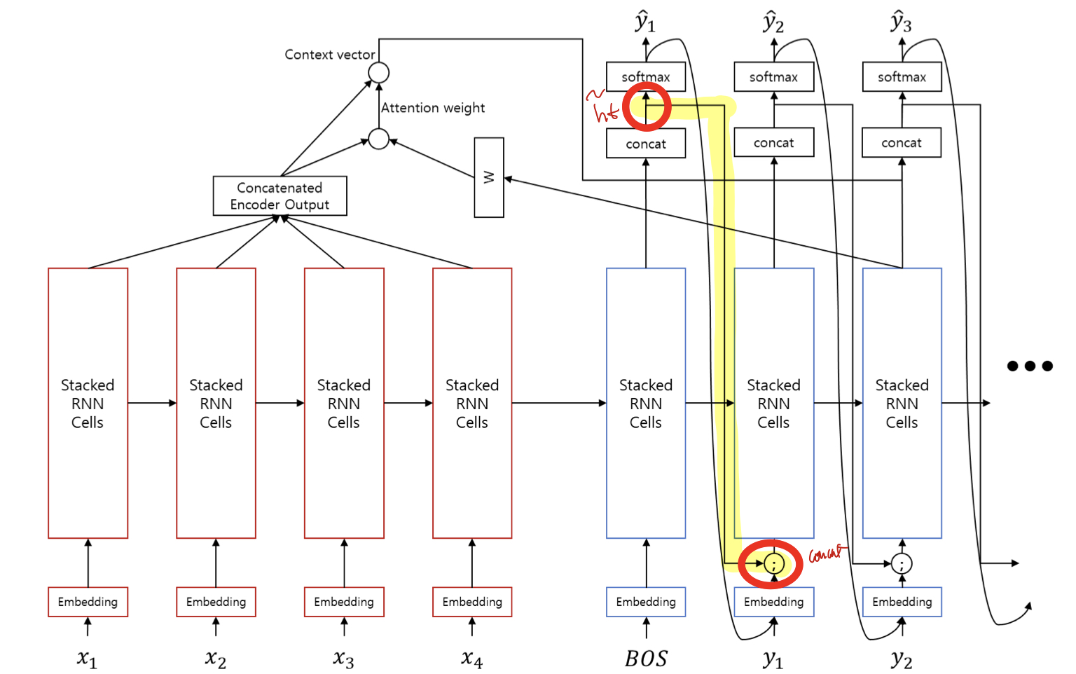현재 디코더의 히든 벡터와 concat(정보 보충)해서 최종 출력을 생성하는 흐름이다.