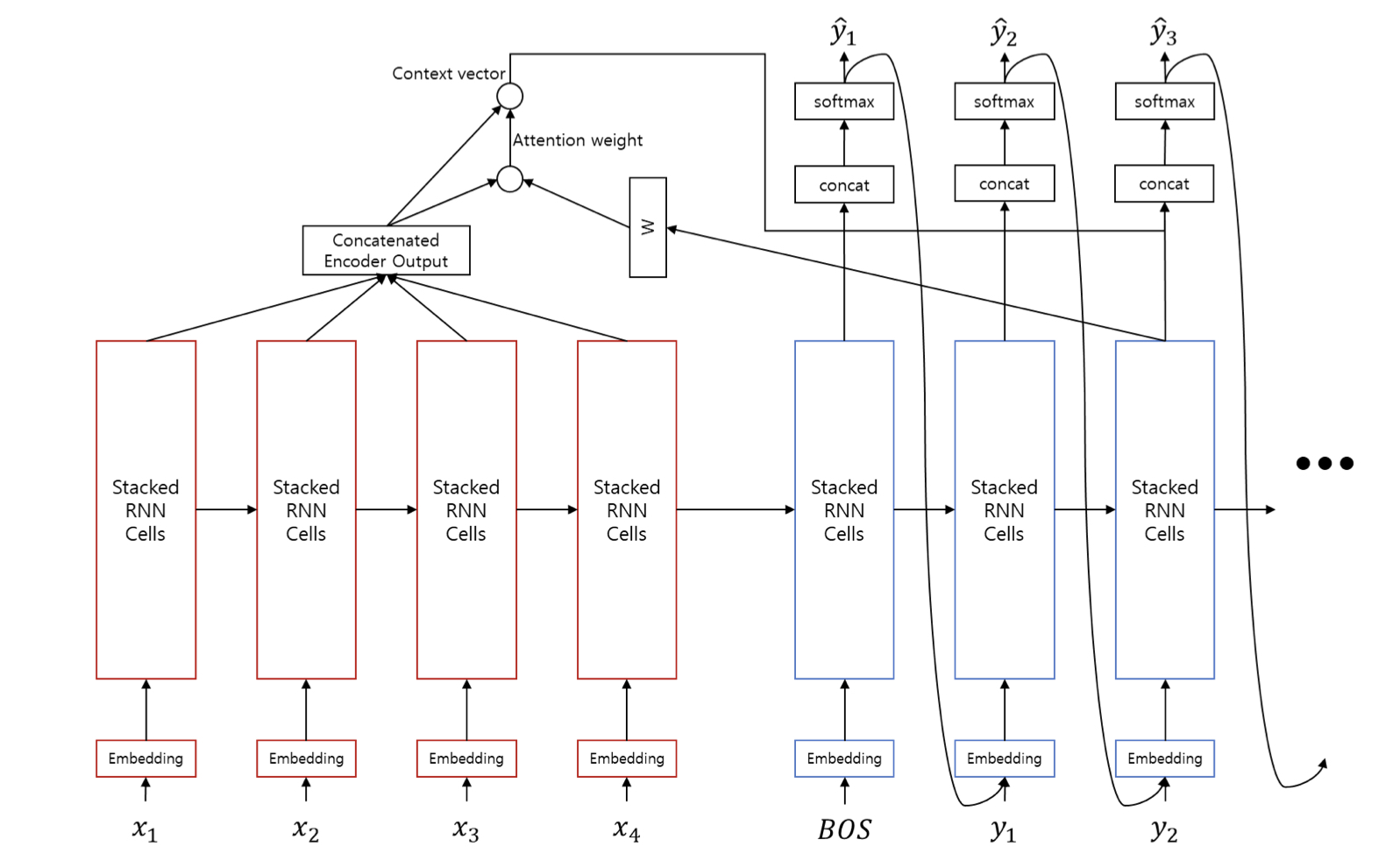 인코더 및 디코더 블럭은 RNN 계열의 모델로 구성 되며, 여러 레이어로 쌓아서 쓰기도 한다.