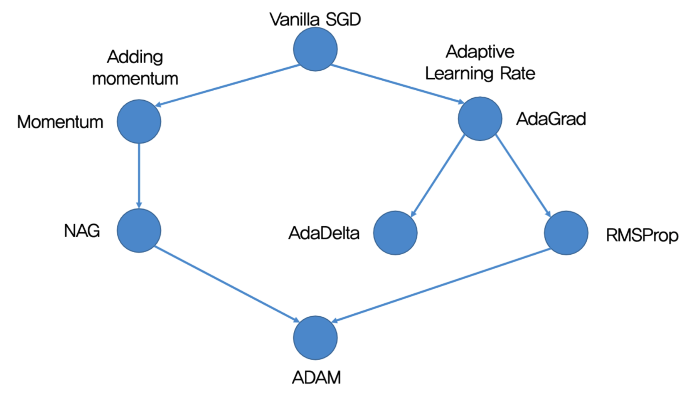 아래와 같은 흐름으로 옵티마이저의 발전 흐름을 정리할 수 있다.