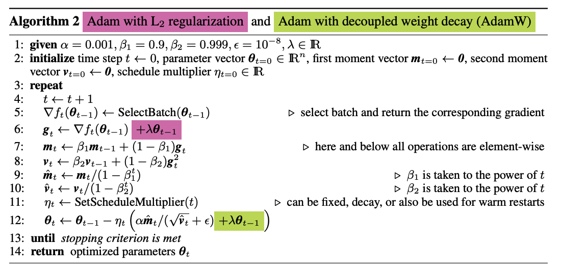따라서 L2 regularization과 별도로 weight decay를 위한 텀을 수식에 추가하여 AdamW가 만들어졌다.