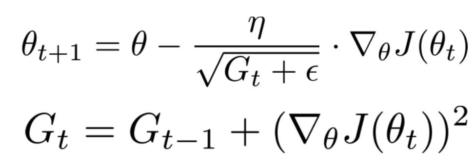 G_t + 엡실론(0으로 나눠지는 것 방지 위한 작은 상수)으로 러닝레잇을 나눠줌으로써