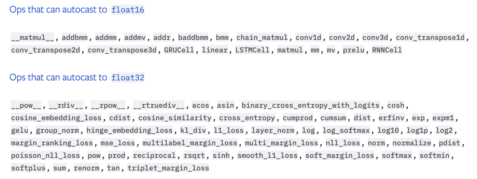 The following lists describe the behavior of eligible ops in autocast-enabled regions. These ops always go through autocasting whether they are invoked as part of a torch.nn.Module, as a function, or as a torch.Tensor method. If functions are exposed in mu