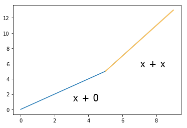ReLU(x)에 의한 직선이고, 시작 된 후엔 x 가 2번 누적되어 기울기가 가파른 직선으로 바뀌게 된다.