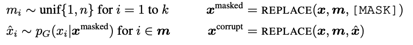 제너레이터는 MLM 으로 학습이 되며, 주어진 입력 x=[x1, x2, ... , xn]에 대해